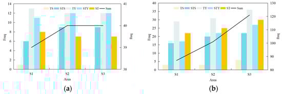 The relationship between central air pressure and maximum wind speed radius was calculated over the years and it was found that the maximum wind speed radius in the Western Pacific Ocean is 180 km, with an average of 90 km [30]. We centered S1, S2, and S3, respectively, as shown in Figure 8, and drew circles with the typhoon path within a 180 km radius of the center of S1, S2, and S3 to analyze the impact of typhoons from 1949 to 2023. The specific paths of each typhoon are shown in the Figure 8. Within a radius of 180 km, an increasing trend is shown for tropical cyclones (TD, 10.8 m/s ≤ < 17.1 m/s), tropical storms (TS, 17.2 m/s ≤ < 24.4 m/s), severe tropical storms (STS, 24.5 m/s ≤ < 32.6 m/s), typhoons (TY, 32.7 m/s ≤ < 41.4 m/s), severe typhoons (STY, 41.5 m/s ≤ < 50.9 m/s), and super typhoons (SuperTY, ≥ 51.0 m/s). Within a 90 km and 180 km radius of the centers S1, S2, and S3, cyclones in regions S2 and S3 are equal, while the number of TS and TY in region S2 is more than in regions S2 and S3, as shown in Figure 9.