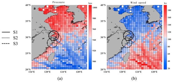 (a) Spatial distribution of the minimum central pressure; (b) spatial distribution of the maximum wind speed.