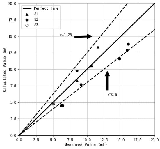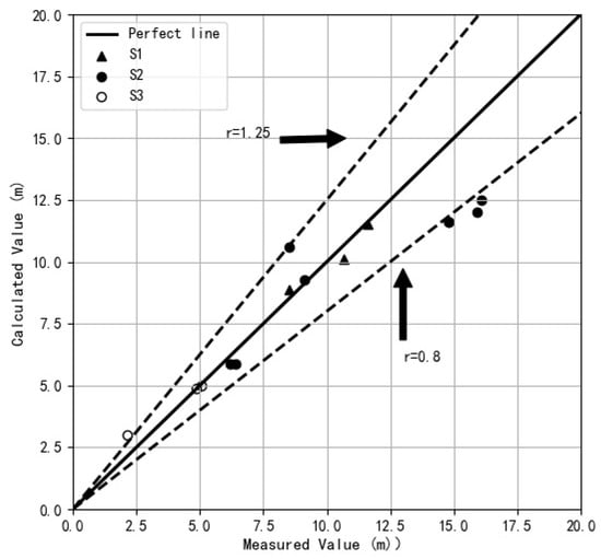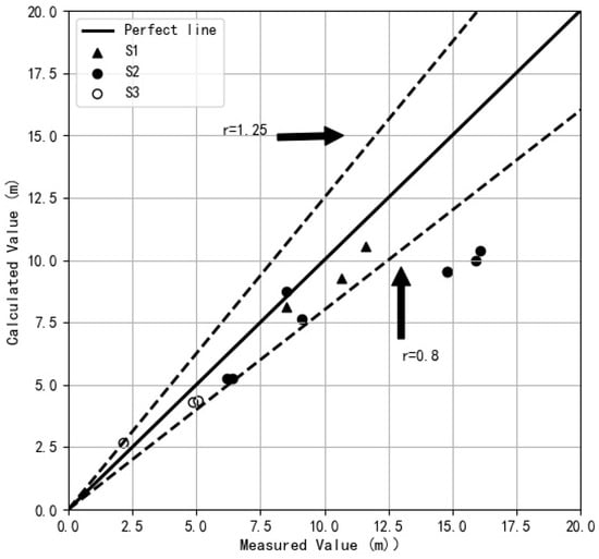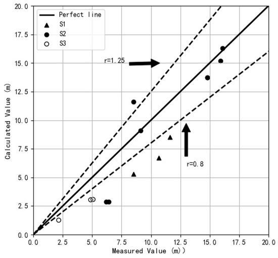 The comparison between the predicted values from various formulas and the measured values is shown in Figure 11, Figure 12, Figure 13 and Figure 14, where the 45° solid line represents the ideal line. Let r be the ratio of the calculated value to the measured value, and the two dashed lines represent r = 1.25 and r = 0.8. The standardized formula, Han’s formula, and Sun’s formula all account for 73% of the data points with values falling into , indicating that these have high accuracy. The scouring value of the bridge pier calculated using the 65-2 formula is significantly lower than the experimental value. The standard calculation results show that except for the calculated erosion value of S2 below 5 m, which is smaller than the experimental value, the performance is better, especially for the high accuracy of S1 prediction results, The calculated values of Han’s formula and Sun’s formula are distributed on both sides of the measured results. Except for the calculated erosion value above 10 m, which is significantly lower than the experimental value, the other study areas perform well.