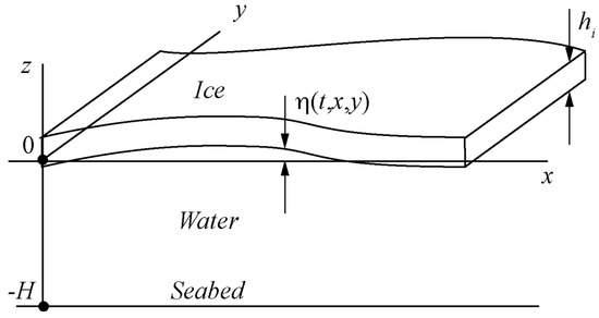 where is time, , and are horizontal and vertical coordinates, is water velocity potential, is the elevation of water-ice interface, is water pressure below ice, is constant water depth, is sea water density, and is the gravity acceleration. The zero value of corresponds to the sea surface. The Laplace Equation (1) follows from the mass balance of fluid of constant density. Equation (2) expresses dynamic and kinematic boundary conditions at the ice-water interface. Equation (3) specifies the condition of impermeability at the bottom. At rest, the ice-water interface coincides with the plane.