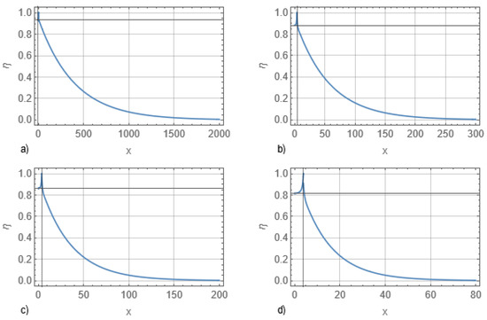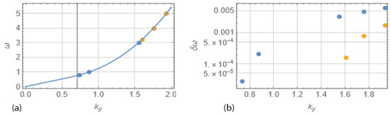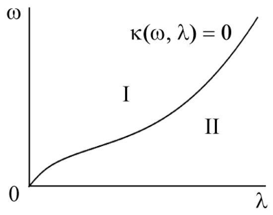 The qualitative shape of the dependence following from Equation (9) is shown in Figure 2. For sufficiently large range of the frequency dispersion Equation (9) has two real roots , four complex roots and , and an infinite number of pure imaginary roots , . Roots , , , and are shown by white circles in Figure 3a. Quantities are positive real roots of the equation.