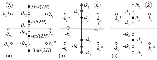 The roots of dispersion Equation (9) in complex plane are related to the roots of dispersion Equation (9) in the complex plane by the formula . The real root corresponds to the real roots in the complex plane if , otherwise, the real root corresponds to pure imaginary roots in the complex plane . This property is mapped in Figure 2 by the regions denoted as I and II. If (Region I) then Equation (9) has two real roots in the complex plane . If (Region II) then Equation (9) has two pure imaginary roots in the complex plane . The roots for . In addition to the roots or dispersion Equation (9) has four complex roots and , and infinite number of pure imaginary roots with and . Figure 3b,c shows the locations of the real and complex roots of Equation (9) when is located respectively in Regions I and II.