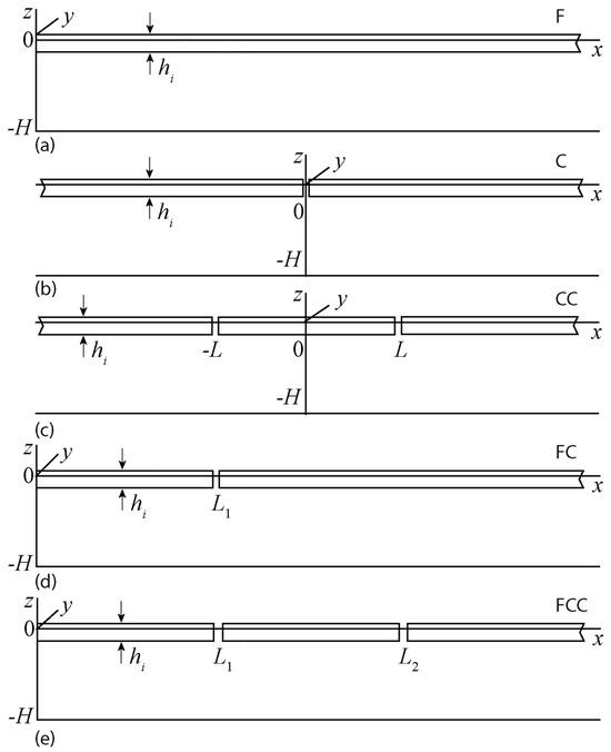Five geometrical configurations of the computational domain modelling coastal zone are shown in Figure 4. Figure 4a shows a water layer of a fixed depth under continuous ice sheet bounded by a vertical shore at . Figure 4b shows a water layer of a fixed depth under an ice sheet with a straight crack at . Figure 4c shows a water layer of a fixed depth an under ice sheet with two straight cracks at and . Figure 4d shows a water layer of a fixed depth under an ice sheet with a straight crack at bounded by a vertical shore at . Figure 4e shows a water layer of a fixed depth under an ice sheet with two straight cracks at and bounded by a vertical shore at . Short names of the geometries of the coastal zone shown in Figure 4 are F, C, CC, FC, and FCC.