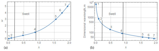 Dispersion curve in dimensionless variables (a). Dimensional wavelength versus dimensionless wave number (b). Point 1 corresponds to the long-period wave, point 2 corresponds to the infragravity wave, points 3 and 4 correspond to the swell and points 5, 6, and 7 corresponds to the flexural-gravity waves.