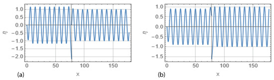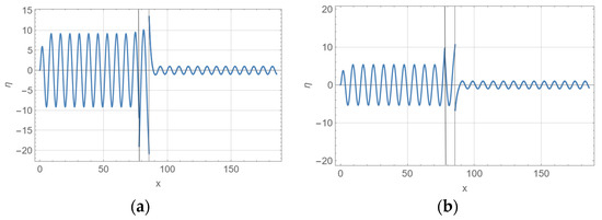 Figure 8 demonstrates that the amplitude of oscillations of becomes much higher in Problem FCC (reflection of the wave from a vertical wall when the ice sheet is split by two cracks at and ). The oscillations are not visible for low-frequency waves with the frequencies and . The amplitude of oscillations is of about 0.1 when (Figure 8a) and increases up to 50 when (Figure 8b). Figure 8 illustrates that increasing of is explained by the increase of the wave amplitude in the region . Figure 9a,b were constructed with the incident angles and , whose values are closed to the local maxima of the function . The local maximum at is greater than the local maximum at (Figure 8b). Therefore, in Figure 9 the wave amplitude in the region is greater at than at .