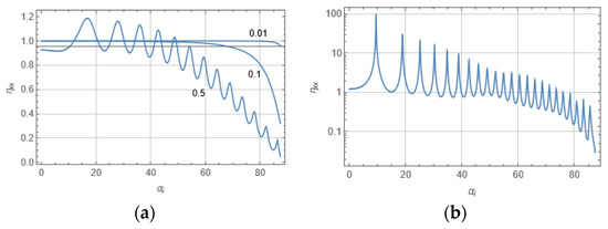 The dependences of from the incident angle in Problem FCC for ω = 0.01, 0.1, 0.5 (a), and ω = 1 (b). Dimensionless wave frequencies are shown in the figures by numbers.