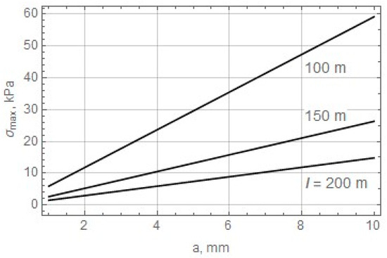 Figure 15 shows the maximal bending stress calculated for three wavelengths m, , and m versus wave amplitude . The reasonable value of swell amplitude in the Arctic is 1 mm. Figure 15 shows that even if the amplification influences increase the wave amplitude 10 times, the maximal bending stress is smaller 100 kPa. Assuming the flexural strength of sea ice 300 kPa or higher [56] we may conclude that the level of amplification obtained in the paper can not influence the bending failure of land-fast ice by swell coming from the Arctic Ocean. The fatigue effect may influence the reduction of bending stress less than two times [57], but it is also not enough to break up the ice. Thus, the action of swell may lead to strengthening of land-fast ice [58].