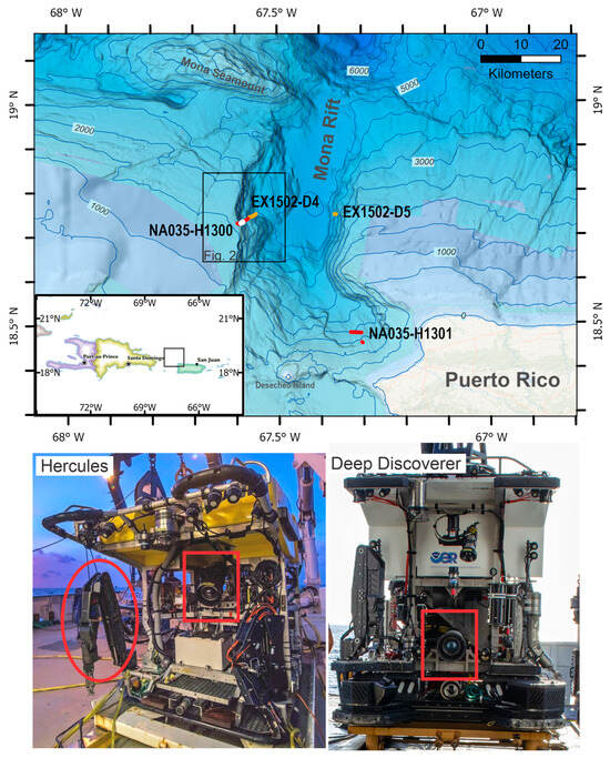- Kennedy, B.R.C.; Cantwell, K.; Sowers, D.; Cheadle, M.J.; McKenna, L.A. EX1502 Leg 3, Océano Profundo 2015: Exploring Puerto Rico’s Seamounts, Trenches, and Troughs: Expedition Report; U.S. National Oceanic and Atmospheric Administration, Office of Ocean Exploration and Research: Silver Spring, MD, USA, 2015. [Google Scholar] [CrossRef]