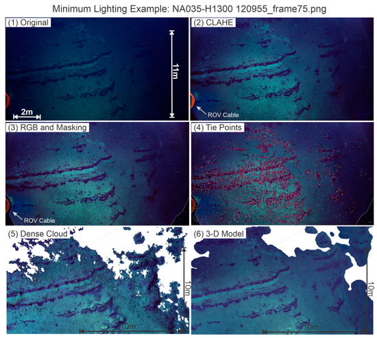 - Low lighting, even after improving the contrast, may impede the software’s ability to pick features to match (see Figure 6). It may be necessary to identify dark or light features and use them as markers to build a camera path, following the procedure in item B above. More than four points may be needed depending on how fast the ROV is moving. Once there is enough light in the images, the software can take over.