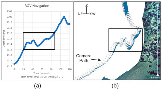 - Navigation: ROV navigation involves acoustic ranging between the ROV and the ship. Acoustic navigation has a limited depth resolution relative to electromagnetic ranging (e.g., GPS) and requires knowledge of sound speed in the seawater column [22]. ROV position was calculated via continuous acoustic ultra-short baseline (USBL) tracking [23]. The USBL position accuracy for the ROV Hercules at the time of data collection was 1° degree, or better than 2% of the slant range [24], which translates to an accuracy of a few tens of meters in deep-water dives. Unlike navigation in the terrestrial domain, the use of preexisting bathymetry for navigation is limited in the deep sea by its resolution (typically 10–25 m or more, depending on water depth) because the bathymetry has been collected by acoustic sounding from surface ships (Section 3.7).