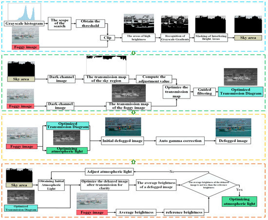 In visual-systems-based research, the assumption that observers are in a transparent medium simplifies their perception of brightness; however, real-world outdoor conditions, including fog, haze, and other weather phenomena, can significantly degrade image quality. Particles (e.g., dust and smoke) scatter light and diminish contrast and visibility, thus posing challenges for critical applications such as maritime navigation and surveillance [1,2,3]. Developing robust defogging techniques is crucial for improving visibility and reliability under diverse environmental conditions [4,5]. Numerous algorithms have been proposed for image dehazing, including the adaptive histogram equalization algorithm, the multi-scale Retinex algorithm, the adaptive smoothing sharpening algorithm, and the color attenuation prior algorithm. However, in images of marine environments, which are influenced by haze and atmospheric light and in which the sky typically occupies a significant portion, the distinction between sky and non-sky regions often becomes indistinct. Consequently, these conventional methods fail to maintain structural integrity and color fidelity in dehazed images, potentially leading to a loss of detail and unnatural coloration in the resulting images.