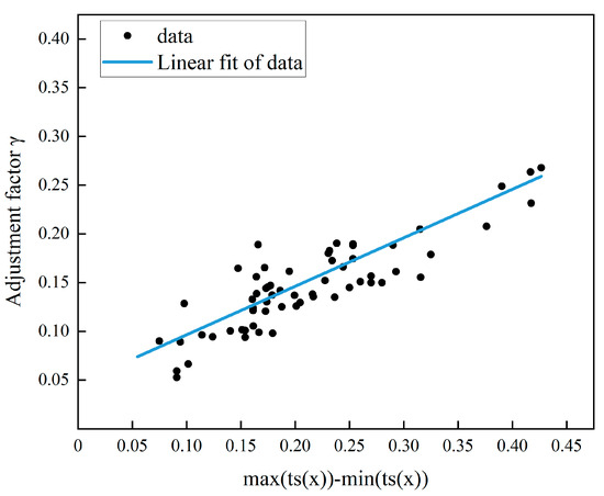 Linear regression fitting depicting the relationship between the sky transmittance range and the adjustment factor γ.