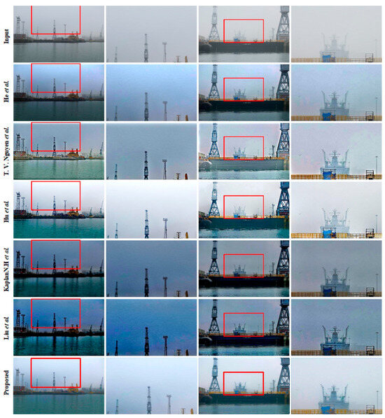 Figure 8 shows and compares the details of dehazed local images. He et al.’s algorithm [11] (second row) darkened the image. The algorithm proposed by T. V. Nguyen et al. [22] (third row) had a better texture quality than the algorithm of He et al. [11] but failed to effectively balance the overall color, resulting in color distortion and artifacts at the edges of objects, thus creating a halo effect. With the algorithm created by Hu et al. [21] (fourth row), dehazing unevenly in the sky area led to a sharpening of local areas after dehazing. The algorithms created by Kaplan N.H. [27] (fifth column) and Liu et al. [18] (sixth column) had better contrast in the dehazed local image, but some details were lost due to the generation of noise. In contrast, the proposed algorithm (seventh row) retained the local details of the image and not only effectively removed fog but also enhanced the contrast and suppressed the generation of noise. As our algorithm takes into account the sea and sky during the dehazing process, the overall resulting image has better smoothness.