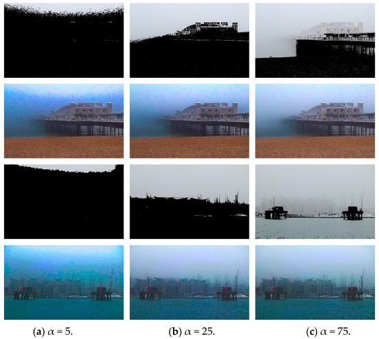 The defogging outcomes of the proposed algorithm for varying α weights: (a) α = 5; (b) α = 25; (c) α = 75. The first and third rows display the outcomes of threshold-based segmentation, while the second and third columns display the corresponding defogged images.