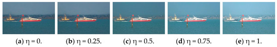 The defogging outcomes of the proposed algorithm for varying η weights: (a) η = 0; (b) η = 0.5; (c) η = 0.5; (d) η = 0.75; (e) η = 1.