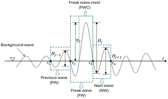 The formal definition of freak waves was first proposed by Klinting and Sand after analyzing a large amount of freak wave data [36]. The definition consists of three conditions summarizing the characteristics of freak waves and their relationship with the surrounding wave environment, as depicted in Figure 2. These conditions are currently the internationally recognized definition of freak waves. These decision criteria are based on the heights of the previous wave (PW), freak wave (FW), and next wave (NW), within the time intervals of , , and , respectively.