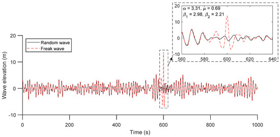 The freak wave parameters reported to have a better freak wave simulation effect by Li et al. [14] have been chosen for the present study. The spectral parameters used in the simulation of freak waves are listed in Table 1. These parameters have the probability of generation of freak waves equal to 1.5% [14]. The random wave was generated from the JONSWAP spectrum with = 6 m and = 10 s, as shown in Figure 3.