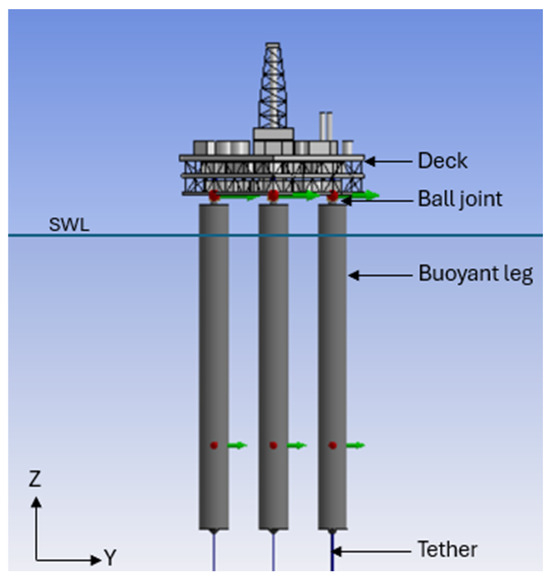 The structural integration of the buoyant legs involves ball joints linking to the deck on one side and taut-moored tethers securing the other side to the seabed. The tethers, modeled as linear cables with suitable stiffness and unstretched length to establish initial tension, play a critical role in the system. The meshing was conducted using a three-dimensional panel method, employing quadrilateral and triangular panels with a program-controlled optimal meshing approach, comprising 17,620 nodes and 17,198 elements. The deck weight and payload were applied at the mass center of the deck. Furthermore, the center of gravity, mass, and moment of inertia were specified as distinct inputs for both the deck and buoyant legs in the design modeler, contributing to the structural definition. The developed numerical model is shown in Figure 6.