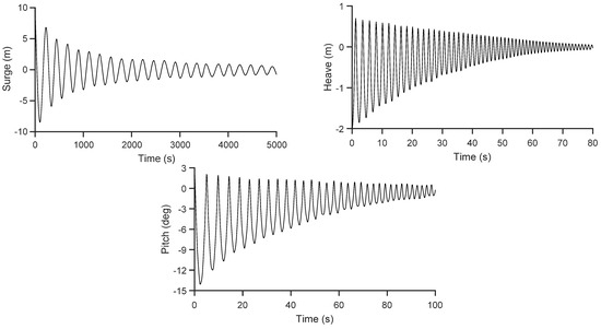 Free decay curves in surge, heave, and pitch degrees of freedom.