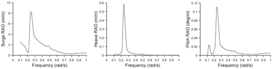 The RAOs were determined by analyzing the response of the offshore triceratops to a range of regular wave frequencies (0.1 rad/s to 1.0 rad/s) at a wave height of 4.0 m. Figure 8 depicts the deck RAOs of the offshore triceratops. Notably, within the assessed frequency range, primary peaks in surge, heave, and pitch degrees-of-freedom occurred at 0.238 rad/s, corresponding to the pitch natural frequency of the buoyant leg. Furthermore, a secondary prominent peak was observed at 0.126 rad/s in the heave and pitch degrees-of-freedom, approximating 5 times the surge natural frequency of the deck and buoyant legs.