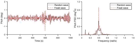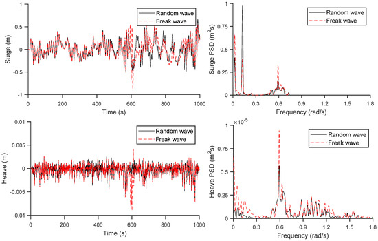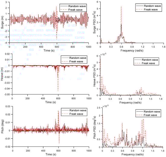 The time series response and PSD plots in the surge, heave, and pitch degrees of freedom are shown in Figure 9. Notably, in the surge degree of freedom, the deck exhibited maximum and minimum responses during the occurrence of a freak wave at 592.2 s and 596.5 s, respectively, within the PW and FW time intervals. Furthermore, within the FW zone, a second maximum peak with a magnitude of 1.50 m was observed at 600.8 s. Similarly, the minimum heave response under the influence of a freak wave was observed at 596.5 s, mirroring the surge response. Analysis of the deck pitch response revealed the occurrence of two positive peak responses at 595.6 s and 600.6 s within the PW and FW zones, respectively. Additionally, the minimum pitch response coincided with the surge and heave responses, being observed at 596.5 s, with a secondary minimum at 608.5 s in the NW zone.