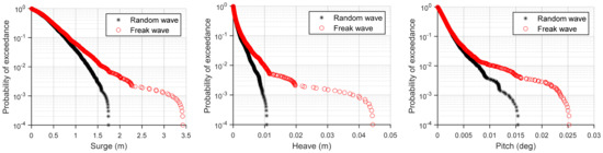 In order to further emphasize the effect of the freak waves, the probability of exceedance of absolute deck responses under random and freak waves is illustrated in Figure 10. As the offshore triceratops responses are inherently stochastic, comparing the probability of deck motion exceedances in different degrees of freedom clearly demonstrates the extent of the freak wave effect on the platform [45,46,47,48]. The comparison indicates that, up to a certain threshold, the probability of deck exceedance under random and freak waves was similar. However, beyond this threshold, the deck responses under freak waves showed an increasing trend. This reaffirms that freak wave action not only amplifies deck motion during the occurrence of the wave (close to ) but also increases the deck motion beyond in various degrees of freedom. The maximum deck responses under random waves (1.74 m surge, 0.01 m heave, and 0.015 degrees pitch) exhibit a probability of exceedance of 0.0001. Correspondingly, the probability of exceedance for the same responses under freak waves was determined to be 0.007, 0.008, and 0.004 in the surge, heave, and pitch degrees of freedom, respectively. This reiterates the magnification effect induced by the presence of freak waves on the deck response.