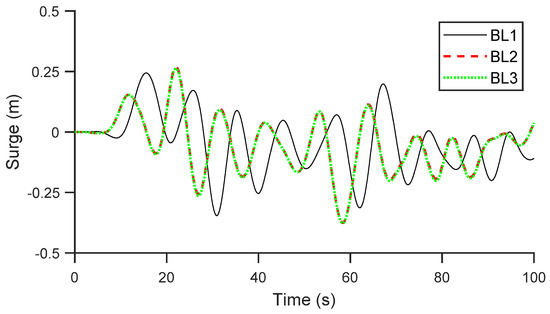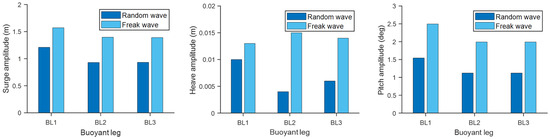 Figure 12 illustrates the varying absolute maximum response amplitudes of all three buoyant legs across different degrees of freedom. Notably, it is evident that the responses of BL2 and BL3 are closely aligned due to their positions in relation to the wave approach angle. Additionally, the surge and pitch responses of BL1 were found to exceed those of BL2 and BL3. In the heave degree of freedom, the most prominent response was observed in BL2 under both wave scenarios. It was observed that the impact of a freak wave was notably greater in the case of BL2 in the surge, heave, and pitch responses, with an increase of approximately 33.38%, 73.33%, and 43.67% compared with the responses under random wave conditions, respectively.