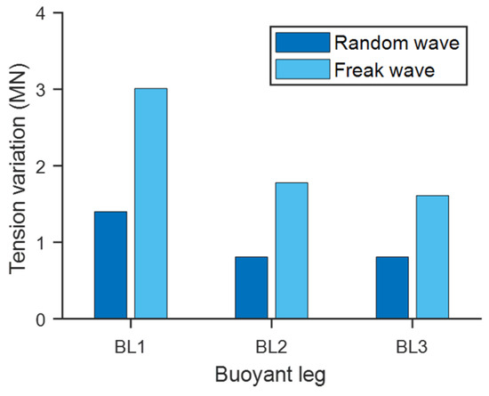 The variation in tether tension within all three buoyant legs was carefully examined, and the corresponding statistical analysis findings are detailed in Table 9. It was noted that the occurrence of freak waves led to a 2.6-fold increase in tether tension. Additionally, a noticeable shift from the initial pretension was observed, particularly pronounced in the case of BL1. Furthermore, analogous to the responses observed in the deck and buoyant legs, the effect of these extreme waves resulted in an increase in the standard deviation of tether tension.