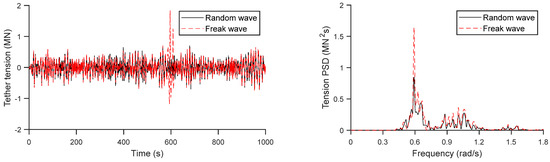 In order to provide a clear understanding of the impact of freak waves, the variation in tether tension was depicted by establishing the initial pretension of the tether as the zero-mean value in Figure 15. The occurrence of maximum and minimum tether tension under freak waves was noted at 596.4 s and 593.4 s, respectively, within the FW zone. Additionally, a second maximum peak was identified at 608.8 s within the NW zone. The timing of peak tether tension responses closely mirrored the peak heave response in the buoyant legs. The tether tension PSD, as depicted in Figure 15, revealed a dominant peak at the wave frequency under both random and freak waves. Furthermore, the PSD magnitude under the freak wave was nearly twice as large as that associated with random waves. Notable peaks in the frequency range of 0.8–1.2 rad/s were also observed in the PSD plot, similar to the response of the buoyant legs in heave degree of freedom. Despite a similar tether tension PSD pattern under both scenarios, the magnitude under freak wave was consistently higher across all observed peaks.