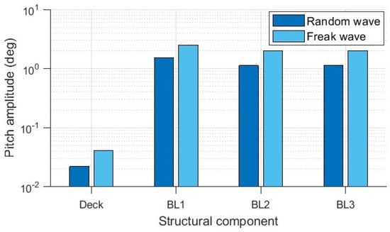 One of the main advantages of offshore triceratops that can extend their operability to ultradeep waters is the presence of ball joints, which restrain the rotational motion from the buoyant legs to the deck. To evaluate the effectiveness of the ball joints, the comparison of the absolute maximum pitch responses of the deck and buoyant legs under random and freak waves is presented in Figure 16. The results demonstrate that the pitch response of the deck is minimal compared with that of the buoyant legs under both wave action scenarios. Even when subjected to a freak wave, which generally amplifies platform responses to all degrees of freedom, the maximum pitch response of the deck is only 0.025 degrees—a value 63 times smaller than the maximum pitch response of BL1 (2.524 degrees). Notably, the maximum pitch response of the deck under a freak wave is even smaller than the maximum pitch response of BL1 under a random wave (0.779 degrees). This underscores the effectiveness of the ball joints in attenuating the deck’s rotational motion, even in extreme environmental conditions.