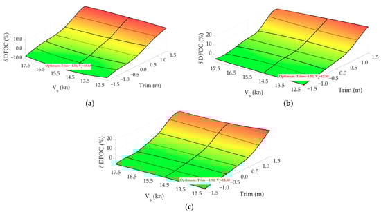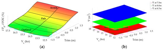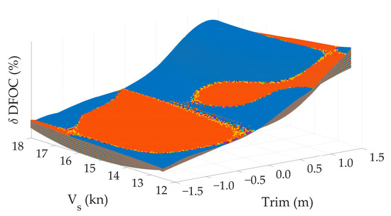 The application provides results based on previously obtained mathematical models for estimating the optimal trim, speed, corresponding mean draft, brake power, DFOC and propeller speed. There is also a note that sign “−” in the Optimum Trim label corresponds to the trim by the bow. Due to the specified project task, which required trim optimization at certain speeds, trims and drafts rather than displacements, it is clear that for the same mean draft and different trims, the vessel has different displacements (due to the different position of the ship, the is different and therefore displacement). Considering the upper limit of the performed calculations with a draft of 8.7 m and taking into account various trims, accordingly, the upper limit of displacements for which the calculations were performed at this draft (8.7 m) is variable (refer to Figure 4b). Considering the obtained results, there is a displacement range where the optimal trim is 0 m, meaning that sailing on an even keel is recommended (see Figure 23). This zone starts from the displacement corresponding to a draft of 8.7 m and even-keel position.