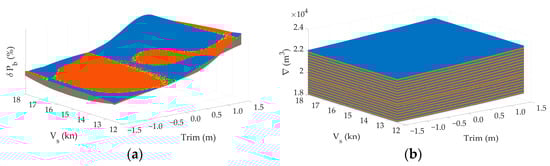 Additionally, values between drafts of 7.5 m and 8 m and from 8 m to 8.7 m are linearly interpolated with a step of 0.01 m. Thus, from the initial matrix of 3 × 7 × 3 (3 speeds, 7 trims, 3 drafts), matrices () of size 151 × 111 × 120 are obtained where is or .