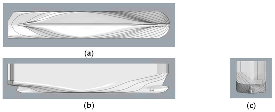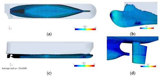 where is the wall shear stress. This presents a contradiction as follows: determining the thickness of the initial layer requires knowing the stress on the vessel’s hull, which in turn needs to be assessed using CFD. Hence, the recommendation from the ITTC [46,56] is utilized in this scenario to compute the wall shear stress for the hull.