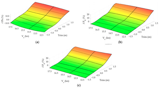 The first outcomes from the CFD simulations are the brake power and propeller speed for one ship speed and draft, i.e., trim, i.e., displacement. The results are presented in the form of relative differences between the brake power of the trimmed ship and the ship on an even keel. A negative sign indicates that there is a saving, i.e., a reduction in the required brake power for that case. A graphical example of the results is shown in Figure 3a, where the relative brake power and fuel oil consumption savings are depicted as an area with the ship speed on the x-axis, trim on the y-axis and relative power/fuel oil consumption savings on the z-axis. The optimal (favorable) sailing zone is depicted in green on the same diagram, meaning that at the current trim and speed, less power or fuel oil consumption is required compared to when the ship is sailing on an even keel. The yellow zone represents the transitional zone where the change in the required brake power/fuel oil consumption is negligible, while the red zone is the zone to be avoided because more power/fuel oil is needed for the ship to sail at the same speed compared to sailing on an even keel. Each point on the surface in Figure 3a corresponds to a certain displacement, where it depends solely on the trim. For easier calculation, a surface (trim, ) is formed from each line (trim), and the surfaces for all three considered drafts are shown in Figure 3b. In order to have smooth surfaces, all values estimated from the CFD analysis are linearly interpolated. Therefore, the initial matrix 3 × 7 (3 speeds, 7 trims) is reshaped to 151 × 111 with a speed step of 0.05 kn and trim step of 0.02 m. The main parameters from the initial matrix are depicted with black lines in Figure 3a.
