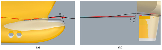 Trim optimization was conducted for drafts of 7.5 m, 8 m and 8.7 m at speeds of 12.5 kn, 15 kn and 18 kn at 7 different conditions (trims). The range of trims goes from −1.5 m to 1.5 m with a 0.5 m step. A negative sign means the trim by the bow and a positive sign, the trim by the stern. The outcome of trim optimization in CFD analysis typically involves determining the optimal trim settings for a vessel at considered drafts and speeds. This optimization aims to minimize resistance and ensure optimal performance under different operating conditions. By adjusting the vessel’s trim, operators can achieve better hydrodynamic characteristics, leading to improved overall performance and operational efficiency. With the available specific fuel oil consumption (SFOC) curve as a function of , a possible reduction in fuel consumption was also calculated.