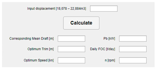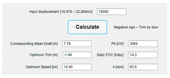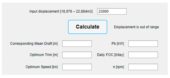 In the “Input displacement” label, the user should insert the current displacement in cubic meters in the range from 18,078 to 22,884 m3. The estimation of the optimal trim, corresponding mean draft, estimated speed, brake power, DFOC and propeller speed is performed by simply clicking the “Calculate” button. In case the user inputs a displacement below or above the specified values, despite the stated applicability limits of the mathematical model, and initiates the calculation, a message will appear on the screen: “Displacement is out of range” (see Figure 21).