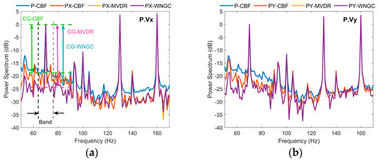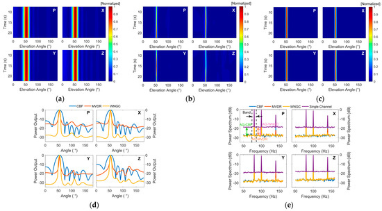 Figure 13 displays the output power spectrum normalized at 70 Hz following phase difference compensation. One can observe that the CBF significantly reduces the noise and obtains an appreciable processing gain. MVDR and WNGC further suppress the noise of the frequency of interest, leading to a higher processing gain than CBF. This high gain can also be attributed to the elevation angle energy distribution. As depicted in