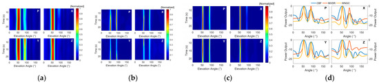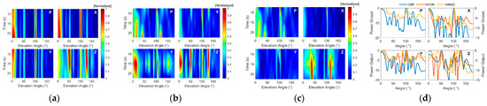 Figure 19d, although the main lobe of MVDR and WNGC is narrower than that of CBF, the side lobe is significantly upgraded. Moreover, the projection of the signal on the Z axis is small because of the distance. The Z-axis noise is mainly distributed on the sea surface above the array, and the projection component of the noise is large according to the cosine relationship. Consequently, the SNR of the vertical particle velocity is quite poor, and the main lobe of the beamforming can no longer reflect the target direction correctly. Actually, the elevation angle estimation performance of each sub-array is superior under close-range conditions. As the range increases, the performance of each sub-array decreases, especially for the Z sub-array. Hence, only the sound pressure and horizontal particle velocity channels are analyzed below.