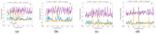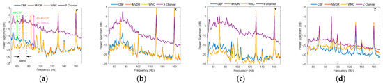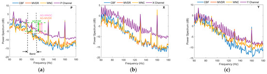 Figure 14. On the other hand, the high-gain method is ineffective against the weakly correlated noise. Consequently, the AG−CBF and AG−MVDR of the Z sub-array are lower than those of the other sub-arrays. Moreover, the WNGC method does not enhance the processing gain of the Z sub-array, which is consistent with the simulation results. This approximate substitution is based on the condition that the noise is flat near the frequency band of the signal of interest and can only qualitatively illustrate the effect of the vertical correlation of the noise on the array gain.