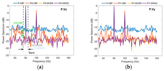 Figure 21b. For 100 Hz, the maximum gain of WNGC−CP−VHVA is 8.04 dB, which is 5.2 dB higher than that of CBF−PHVA. As the frequency gradually increases to 130 Hz and 160 Hz, both the WNGC−CP−VHVA and CBF−PHVA are improved due to the gradual enhancement in the SNR. The difference between the two is about 8 dB. In this case, the larger spatial gain occurs at high frequency for two main reasons. Firstly, the high-frequency signal has a higher SNR with less noise and interference. Secondly, the phase difference between the pressure and particle velocity of the high-frequency line spectra in the equivalent vector element remains more stable.
