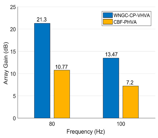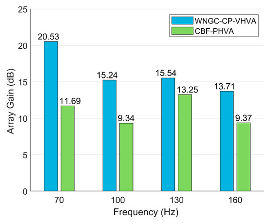 Figure 17, the maximum gain of WNGC−CP−VHVA can reach 20.53 dB at 70 Hz, which can be improved by 8.8 dB compared with CBF−PHVA. As the frequency increases, the vector array’s spatial gain is still significantly higher than that of the sound pressure array conventional processing, but the improvement value gradually degrades. At the frequency of 160 Hz, which is greater than the half-wavelength frequency, the spatial gain of VHVA can only be improved by 4.3 dB. When the SNR of the received signal is strong and the energy of each line spectrum is similar, the vector array gain corresponding to low-frequency targets with frequencies less than half the wavelength of the array is higher. As the frequency increases, the vector array gain gradually decreases, and the advantage of high gain also gradually weakens.