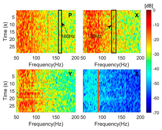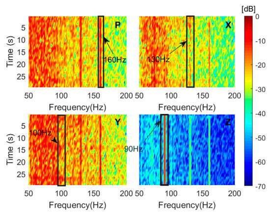 Figure 10 presents the spectrogram of the signal received by the first vector hydrophone, from which we can find the line-spectrum components of 130 Hz and 160 Hz. Due to the high energy of low-frequency noise, the line spectra at 70 Hz and 100 Hz are submerged in the noise. There exists a strong interference of 90 Hz in the Z channel, which is caused by cable disturbance and does not affect the signal components during processing.