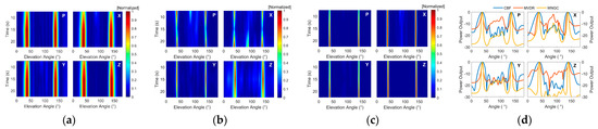 Figure 12 displays the spatial distribution of white noise gain for the CBF and MVDR techniques. The location of the angular grooves reflects the estimated elevation angle, and the depth of the grooves indicates the robustness of the method. The estimated elevation angles for each sub-array are approximately 40°, with symmetrical angles along the array normal direction reflecting the grating lobe position. In addition, the grooves of the X and Z sub-arrays are shallower compared to those of the P and Y sub-arrays, indicating marginally greater robustness and lower processing gain. The green solid line in