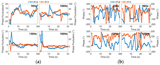 Figure 16a visualizes the fluctuation in the signal phase difference around the mean value. Due to the high noise in the low-frequency target line spectrum, there is phase difference fluctuation under the cooperation of the signal and noise. Therefore, the range of phase difference fluctuation in the 70 Hz and 100 Hz frequencies is up to 50°. As the frequency increases, the signal in the received data becomes more “pure”, and the phase difference between sound pressure and particle velocity is controlled within 20°, resulting in an increase in conventional combination gain compared to low frequencies. The energy proportion of the low-frequency line spectrum signals is lower, and the gain enhancement effect obtained through WNGC processing is better. Therefore, the WNGC combination gain is higher under low-frequency conditions.