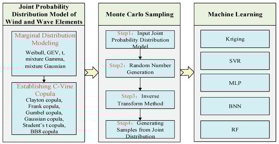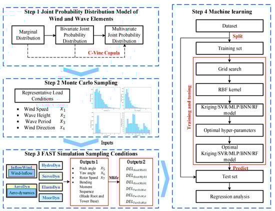 The fatigue load modeling method proposed in this study mainly includes three parts: (1) Establishing a four-dimensional joint probability distribution model of wind and wave variables based on Vine copula theory. (2) Determining representative wind and wave load conditions using the Monte Carlo sampling method. (3) Establishing a data-driven fatigue load model for floating wind turbines based on machine learning models. The schematic diagram of the methodology in this paper is shown in Figure 1. The abbreviated terms involved in the principle of the method proposed in this paper are listed in the Abbreviations section in the back matter.