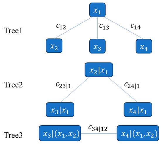 The structure configuration of the C-Vine copula adopts a tree-like structure, focusing on determining the order of root nodes and other nodes. The root node of the C-Vine copula is typically chosen based on its strongest correlation with other variables. This paper uses the sequential estimation method proposed by Aas et al. [28] to determine this. An example of the C-Vine copula tree structure for a four-dimensional random vector is shown in Figure 2. This configuration consists of three levels of trees, each with a main node. The main nodes are connected to other nodes through bivariate copulas, forming edges. These edges then serve as main nodes in the subsequent trees, continuing until all nodes connecting the trees are connected.