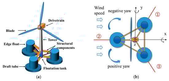 Structure of the NREL 5 MW OC4 Semi-Submersible Floating Wind Turbine. (a) The Structure of Semi-Submersible. Offshore Wind Turbine. (b) Arrangement of Mooring System Structure (①:Number 1 mooring line; ②:Number 2 mooring line; ③:Number 3 mooring line).
