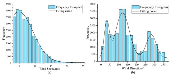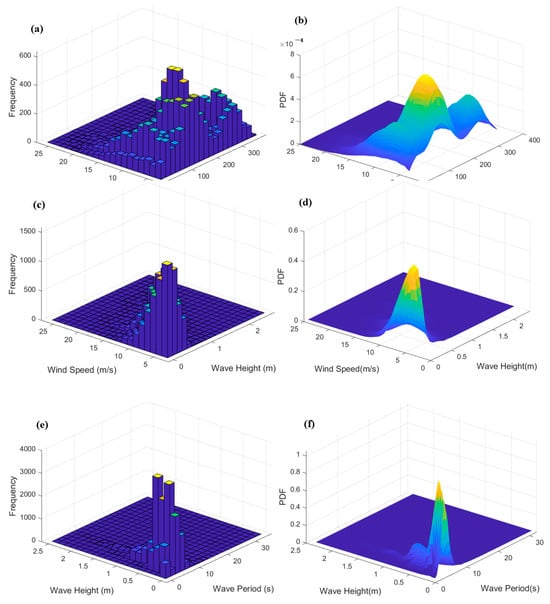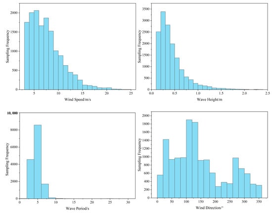 - Detailed analysis of measured data from the Lianyungang marine site in the East China Sea reveals that wind speed, wave height, and wave period exhibit unimodal distribution characteristics suitable for fitting with common unimodal distribution models, whereas wind direction shows multimodal distribution characteristics requiring a mixture model for fitting. Specifically, the optimal fitting distributions are the Weibull distribution for wind speed, Generalized Extreme Value (GEV) distribution for wave height, t-distribution with scale parameter for wave period, and mixed Gaussian distribution for wind direction. The Root Mean Square Error for fitting these four variables is all less than 0.01, indicating the good performance of the selected optimal marginal probability distribution models in fitting;