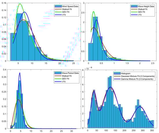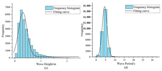 Figure 6a–d depicts frequency histograms and fitted curves of measured wind and wave data from Lianyungang. It is observed that wind speed, wave height, and wave period samples exhibit characteristics of unimodal distributions (Figure 6a–c), fitted using common unimodal distribution models. Wind direction shows a multimodal distribution (Figure 6d) fitted using a mixture model. Additionally, the probability histogram of wind direction reveals three distinct peaks in its distribution. Therefore, a mixture model with three unimodal distribution functions is employed to fit the data, resulting in a mixture model with three dimensions.