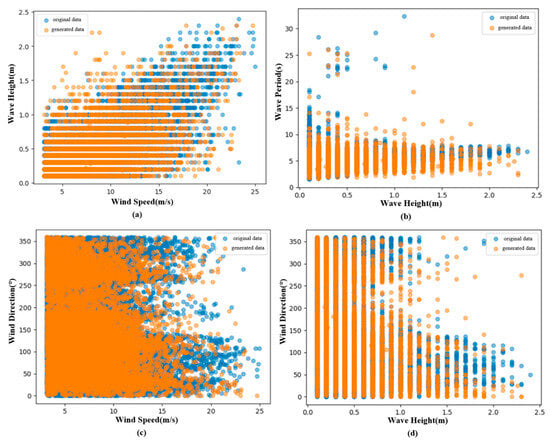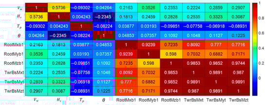 Wind speed at 10 m height (), wind direction (), wave period (), and wave height () are the focus of this study. The reference NREL 5 MW wind turbine hub height is 90 m. Therefore, an exponential profile method [45] is used to convert the wind speed at 10 m height to 90 m height, with the calculation formula as follows: